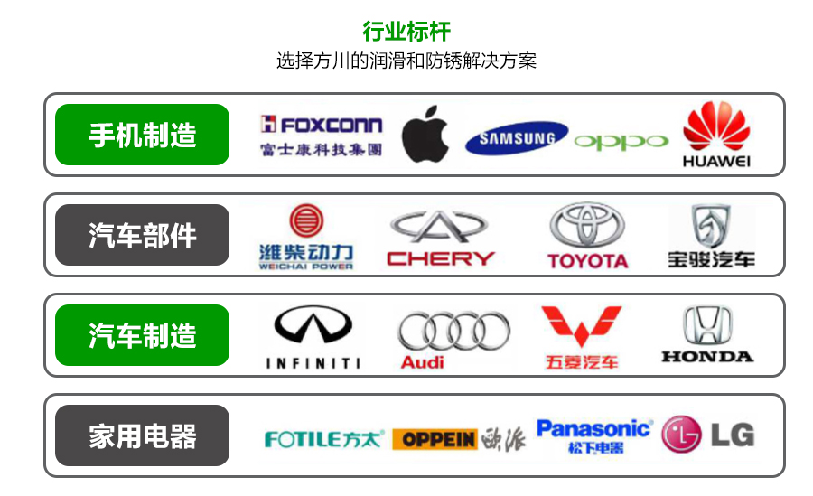 防銹油:方川潤滑是中國國家防銹行業(yè)標(biāo)準(zhǔn)起草單位之一,研發(fā)的分子吸附防銹技術(shù),可滿足苛刻的防銹要求,產(chǎn)品具有優(yōu)異的耐鹽霧耐潮濕性能,在保持經(jīng)濟性的同時不向性能妥協(xié),符合國際環(huán)保法律法規(guī)要求。